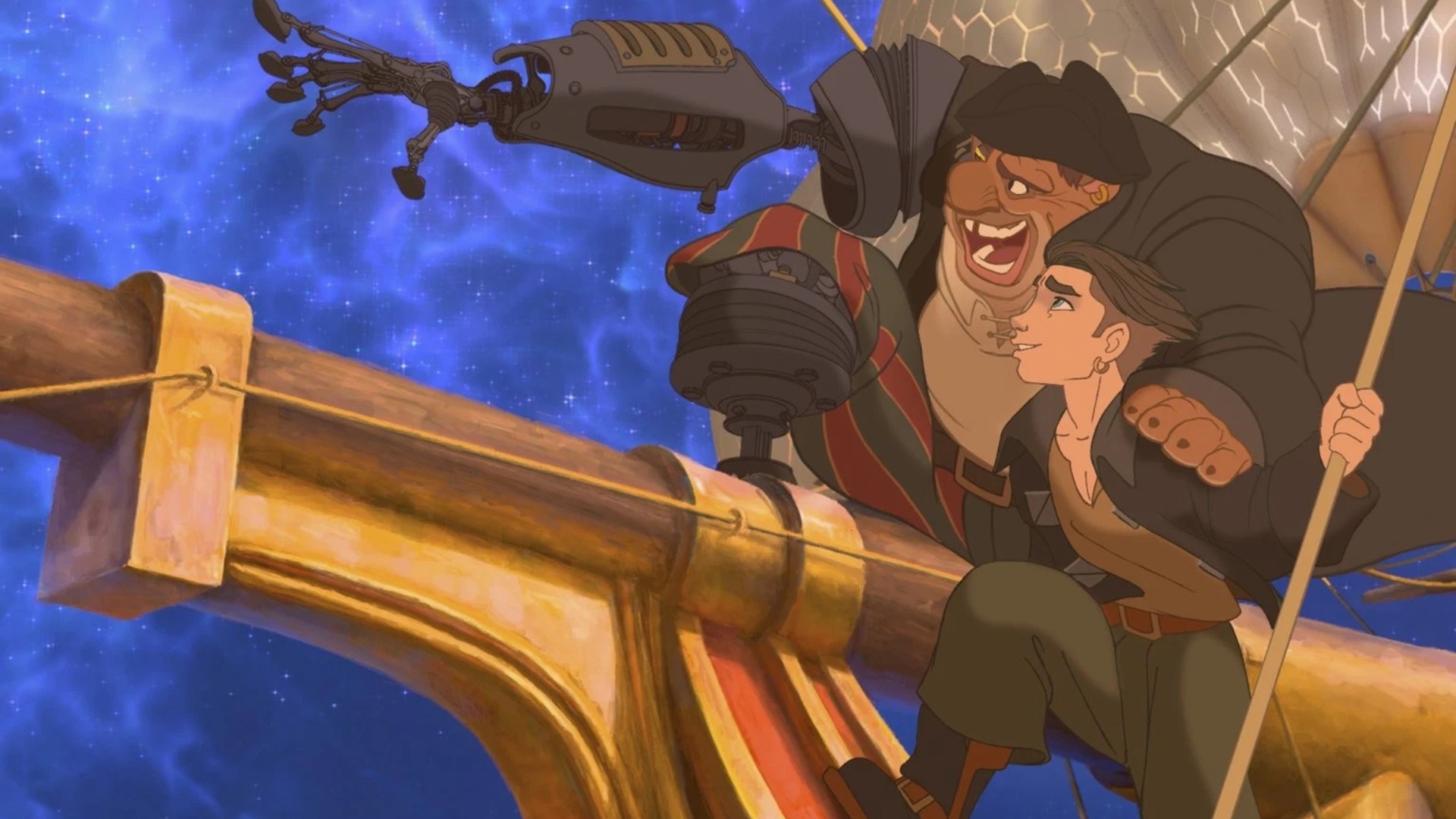 The familiar elements of the original are all here. There’s the young protagonist, Jim Hawkins, voiced by Joseph Gordon-Levitt, who finds a treasure map that promises to lead to fame and fortune. There’s the shifty John Silver, though his peg leg here comes with cybernetic enhancements. The ships they use still look like 18th-century galleons, plucked out of the ocean and sent shooting across the stars.
